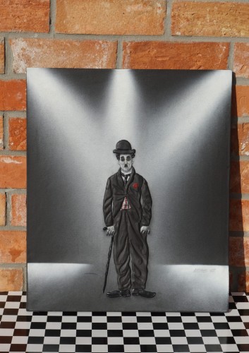 Ręcznie namalowany obraz przestawiający Charliego Chaplina, sygnowany przez autora, data 97 rok. Postać "wypukła". Boki zamalowane na czarno. Obraz w stylu vintage kicz, prezentuje się ekstra ciekawie ;-)